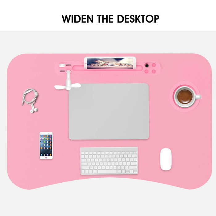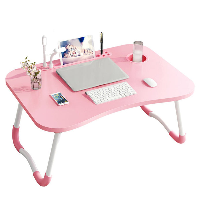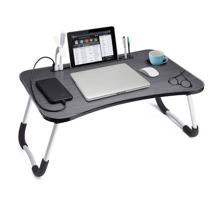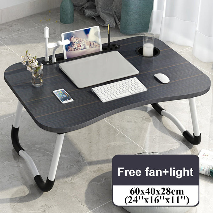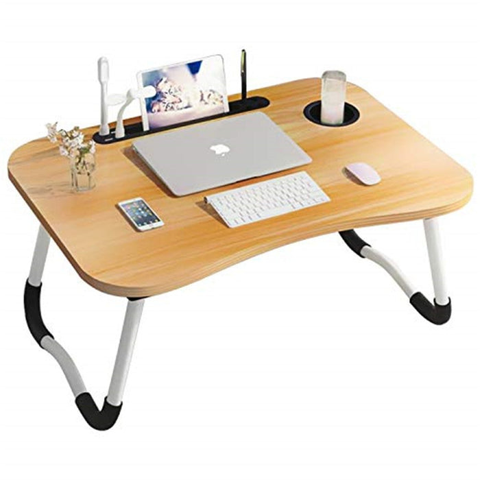 Skládací dřevěný stůl se zakřiveným designem – multifunkční domácí stojan na postel s USB nabíjecím portem, slotem na pero, Macbook a úložiště telefonu – ideální pro malé prostory a domácí kanceláře.