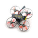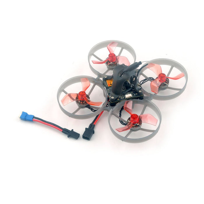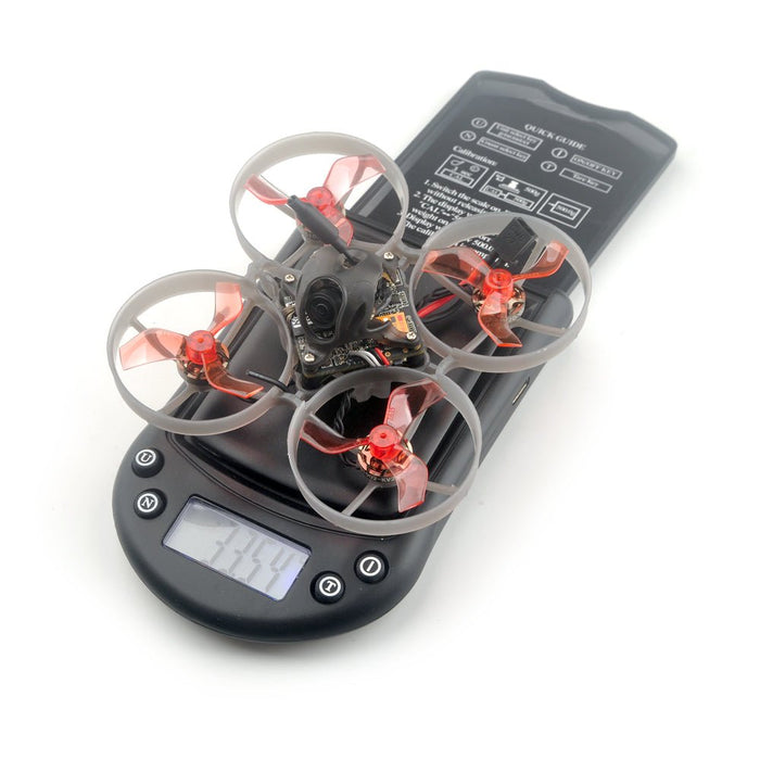 Com uma distância entre eixos de 75 mm, este drone de corrida pesa apenas 33,5 gramas sem bateria. Suas dimensões são 98mm x 98mm x 48mm, tornando-o portátil e fácil de transportar.