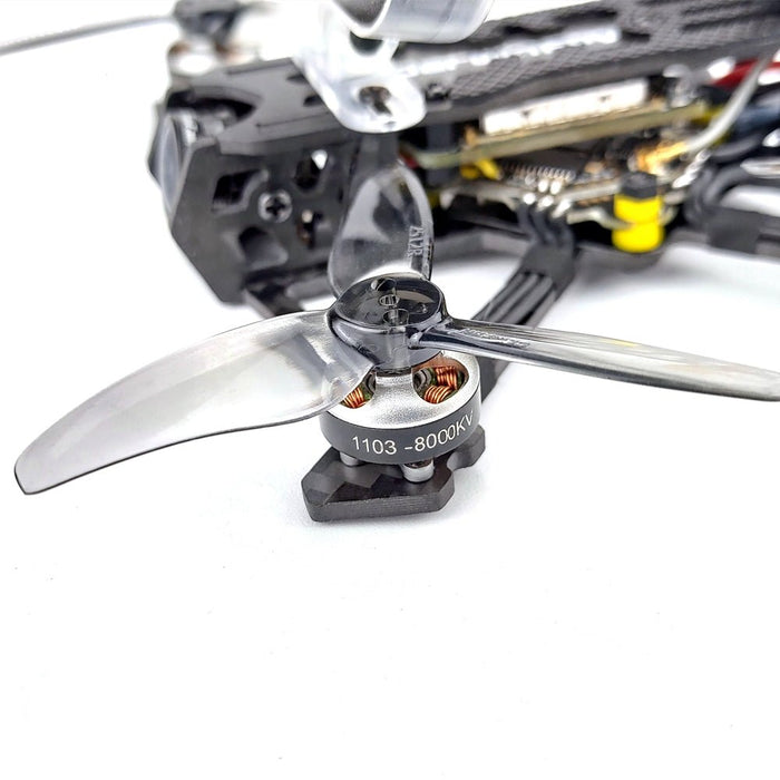 Brezkrtačni motor 1103 8000KV tehta le 3,7 g. Kljub svoji majhnosti zagotavlja impresivno moč in potisk, ki omogoča do 5 minut letenja. Opomba: Motor podpira samo 2S baterije. Priključitev na baterije 3S in premočno pritiskanje plina lahko povzroči trajno poškodbo.